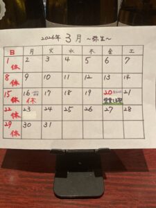 3月の営業カレンダー 2026年3月2日お知らせお初天神 地酒, お初天神 酒肴旬菜 一季, 東梅田 地酒, 梅田 地酒ikki-osaka Tweet 【3月の営業日カレンダー】 ・20日の祝日は営業致します 3月は新酒、春限定酒、蛤、蛍イカ、イサキ、白甘鯛、筍、菜の花、八尾の若ごぼう、蕗の薹など春酒と春の食材をお楽しみ頂けると幸いです!